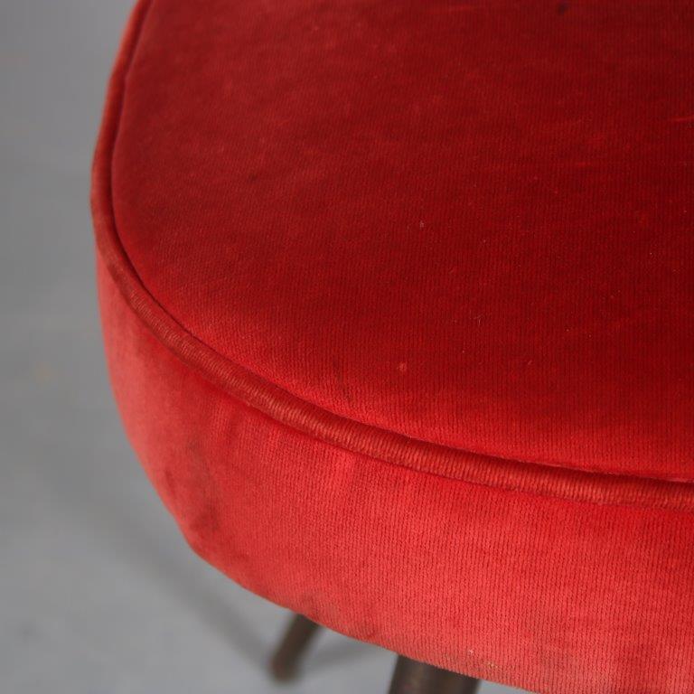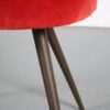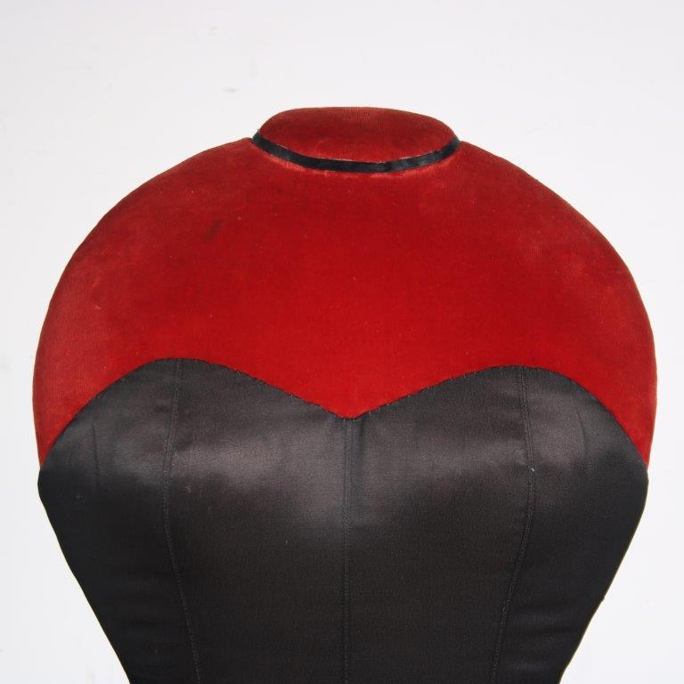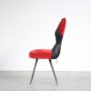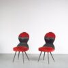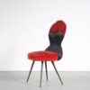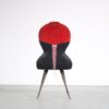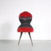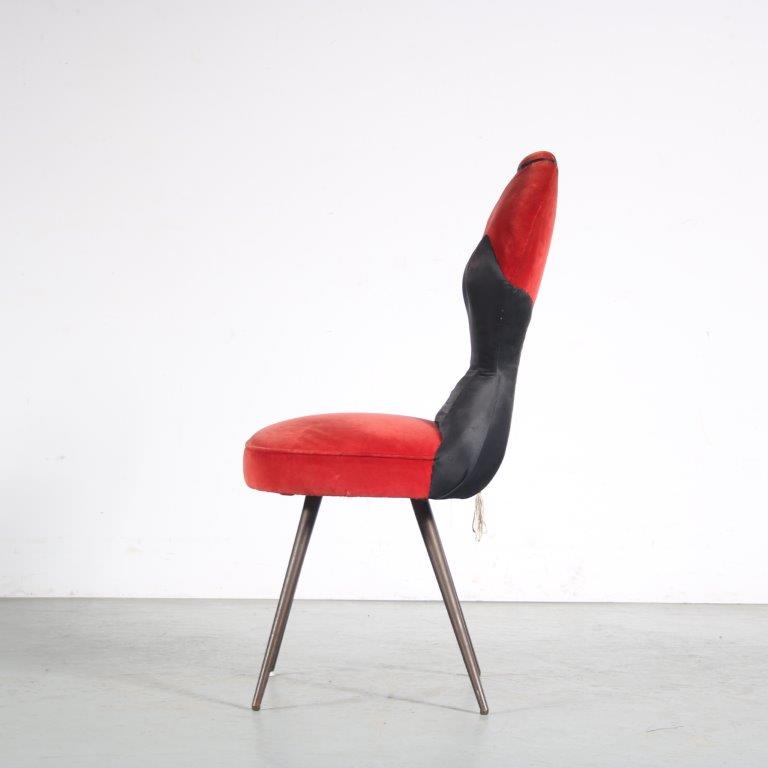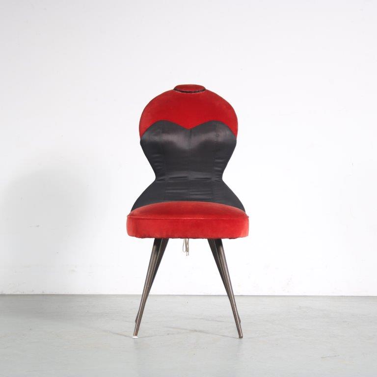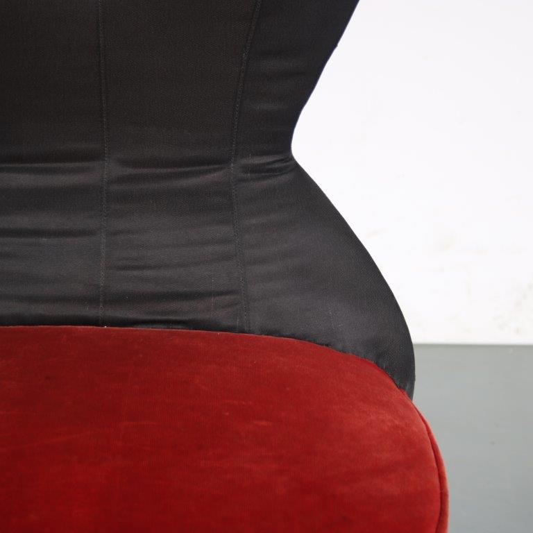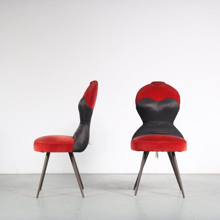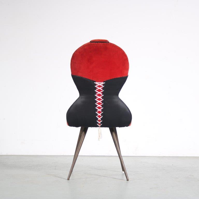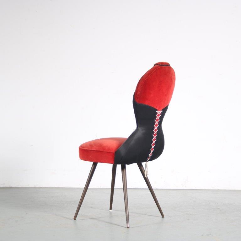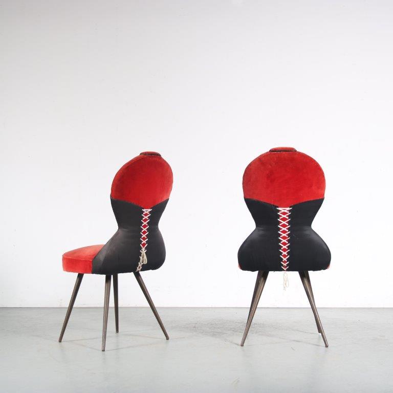 These eye-catching, quality chairs have a very unique style and are impressively well made. Upholstered in high quality red velvet with black skai and brass, tapered legs. The seats have a bust shape that is complimented by the black skai, fitting around the backrest like a corset. The back of the skai is connected with a white rope, which is a perfect finishing touch to this eye-catching set. A wonderful find that will be an impressive addition to any decor!