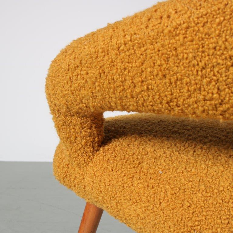 Newly upholstered in high quality ocher bouclé fabric, soft to the touch.
