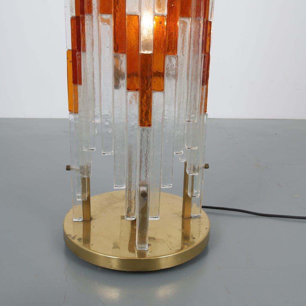 This eye-catching piece is made of high quality clear and orange glass. Made out of many smaller rectangular pieces, creating a beautiful tower-like shape with beautiful orange details. It stands on a round brass foot with brass supports, adding nicely to the luxurious style of the piece.