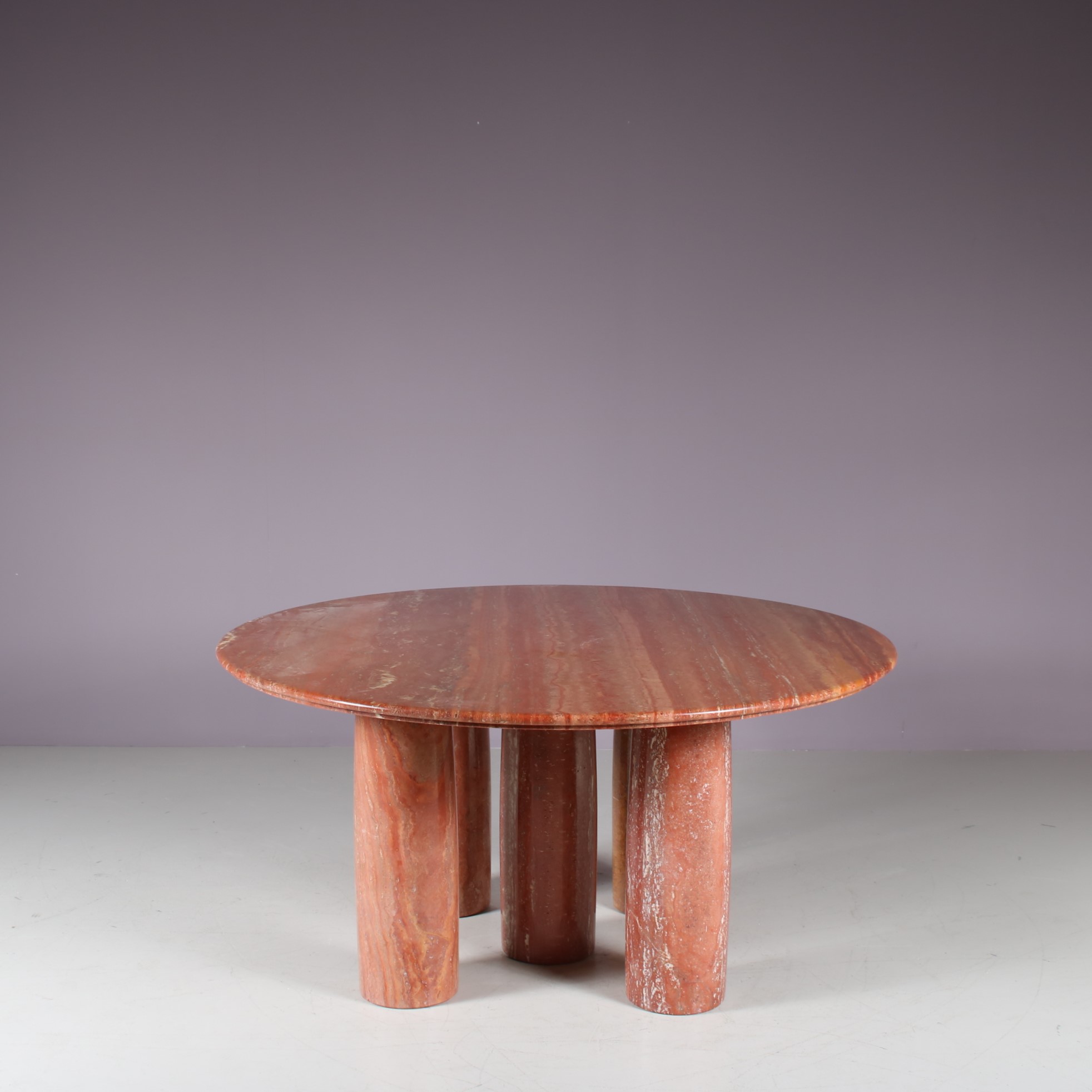 This impressive piece is fully made of high quality red travertine marble, which has a beautiful warm colour and fantastic luxurious appeal. The large round top is held by five cylinder columns for legs, each individually placed after which the top can be placed. The heavy quality of the materials makes the piece strong and stable without any addition connections being used. It’s a beautiful find of mid-century Italian design. A true statement piece in any decor!