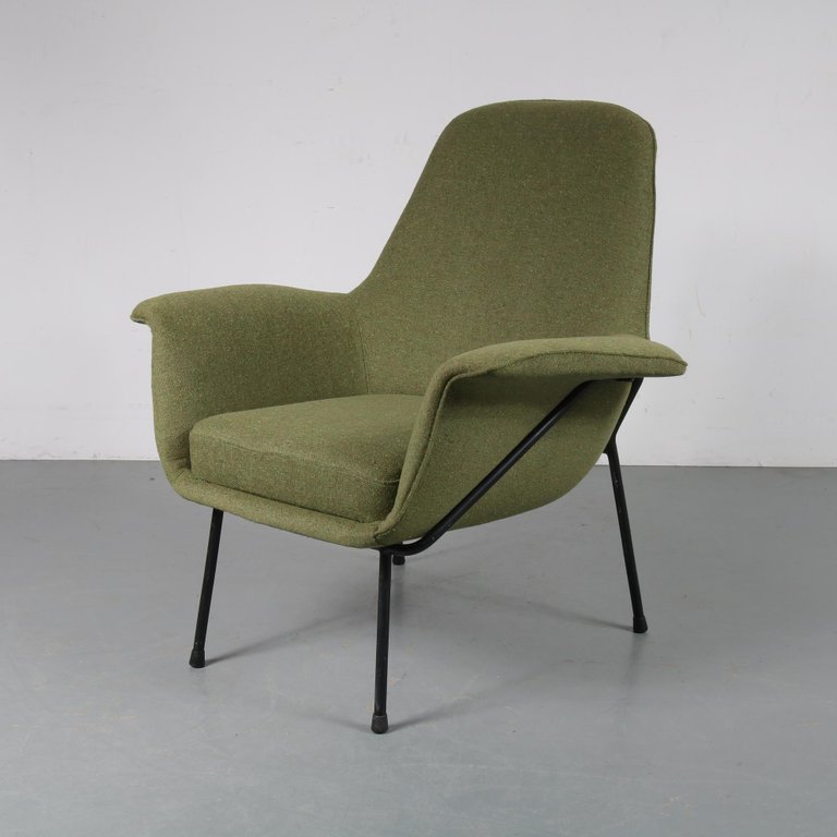 The chair is upholstered in high quality green Kirby Fleck fabric, a beautiful material that creates a nice warm, luxurious appearance. The frame is made of black lacquered tubular metal with beautiful shapes. It has an impressive seating comfort thanks to the ergonomic shape of the design, folded armrests and comfortable cushion. It is a very elegant piece of Italian design that will look great in any decor!