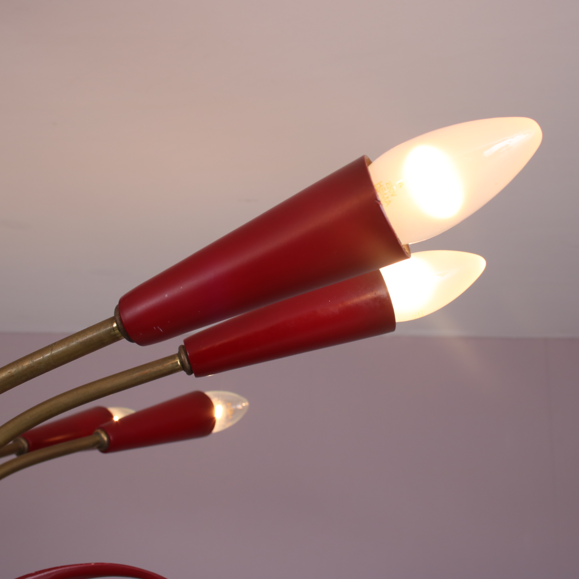 This eye-catching piece is made of high quality brass with red metal details. This combines into a beautiful elegant style, especially in combination with the 12(!) arms with light bulbs. The curved shape of the arms and leaf-like finish to the decorational elements give this lamp a floral appeal. It will be a wonderful addition to any interior adding warmth, luxury and style to any interior!