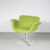 This eye-catching piece has a beautiful elegant style. The seat is nicely bent in a tulip like shape. The curved details are typical for the designs by Paulin! The seat is newly upholstered in high quality bright green coloured fabric. It stands on a chrome plated metal crossbase, the metal nicely bent into shape and finishing the overall appeal of the chair perfectly! The rounded shapes of the design and the integrated armrests all add really nicely to it’s already great seating comfort. A lovely addition to any interior!