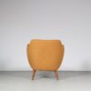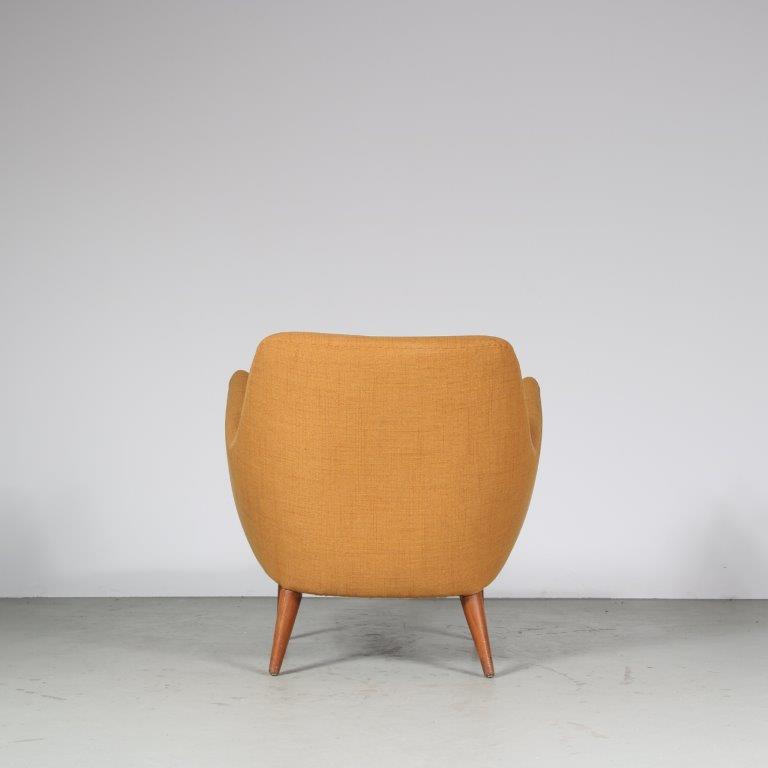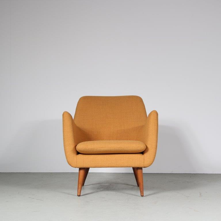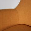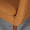 The chair is upholstered in high quality yellow ochre fabric, a beautiful material that creates an inviting appearance that works really well with this design. The legs are made of teak wood in a warm brown colour that adds really well to the appeal of the piece. It has an impressive seating comfort thanks to the seating pillow, it’s ergonomic design, the armrests and gently tilted backrest. It is a very elegant piece of Danish design that will look great in any decor!
