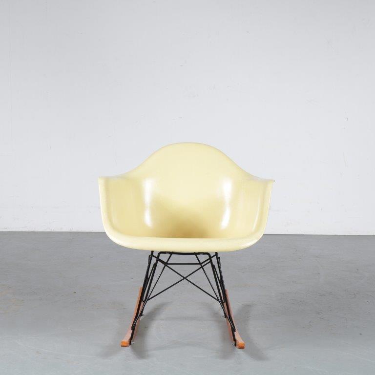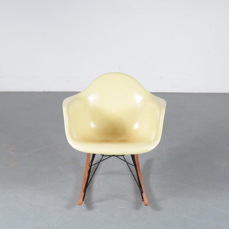 The first fiberglass Eames chairs were produced by Zenith Plastics and came in a limited palate of five colors. The yellow coloured edition is one of those. The early Zenith shells are distinctive for their high fiber content and larger, more substantial rubber shock mounts. It comes on a new rocker base with wooden slates and a black metal frame. The shell is molded from a single piece with integrated armrests, giving the chair a nice comfort and also it’s iconic style that is still famous and popular around the globe!