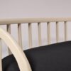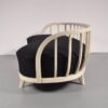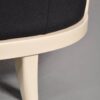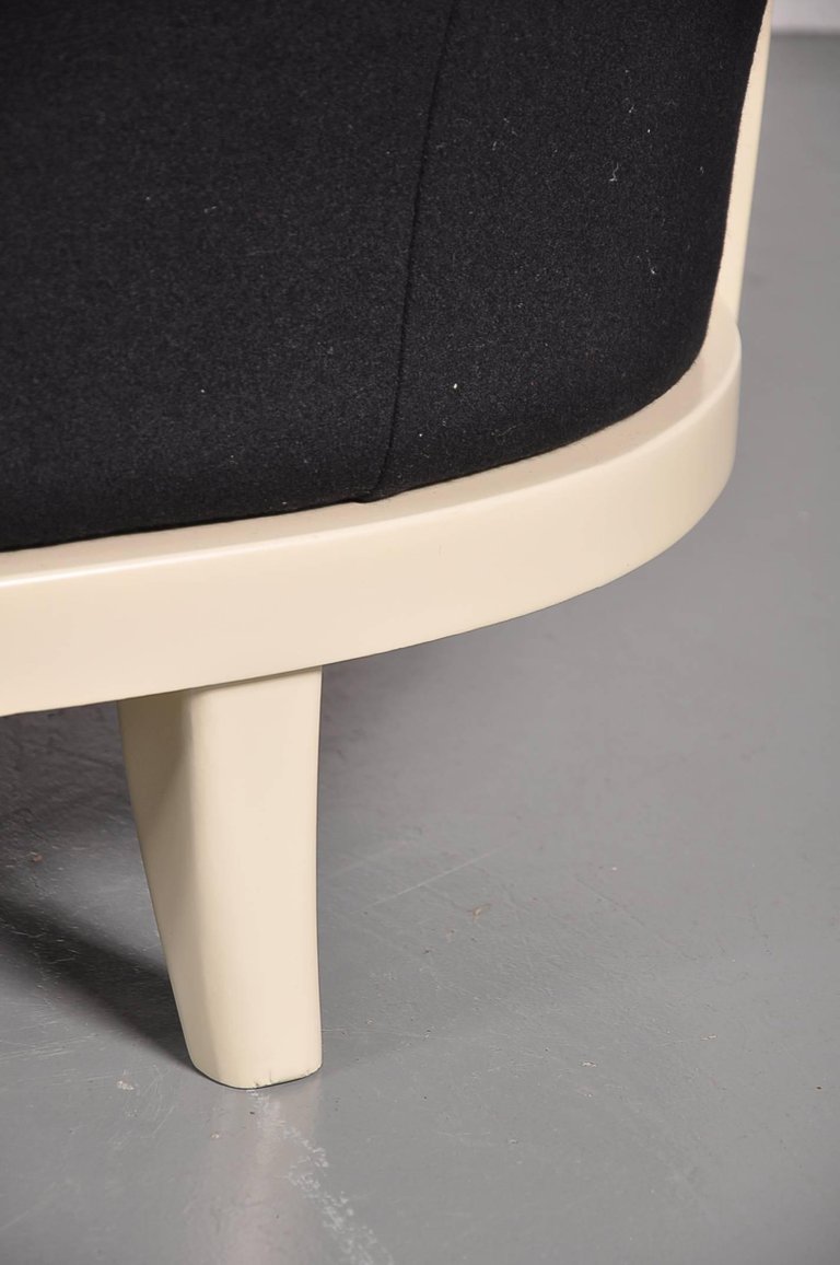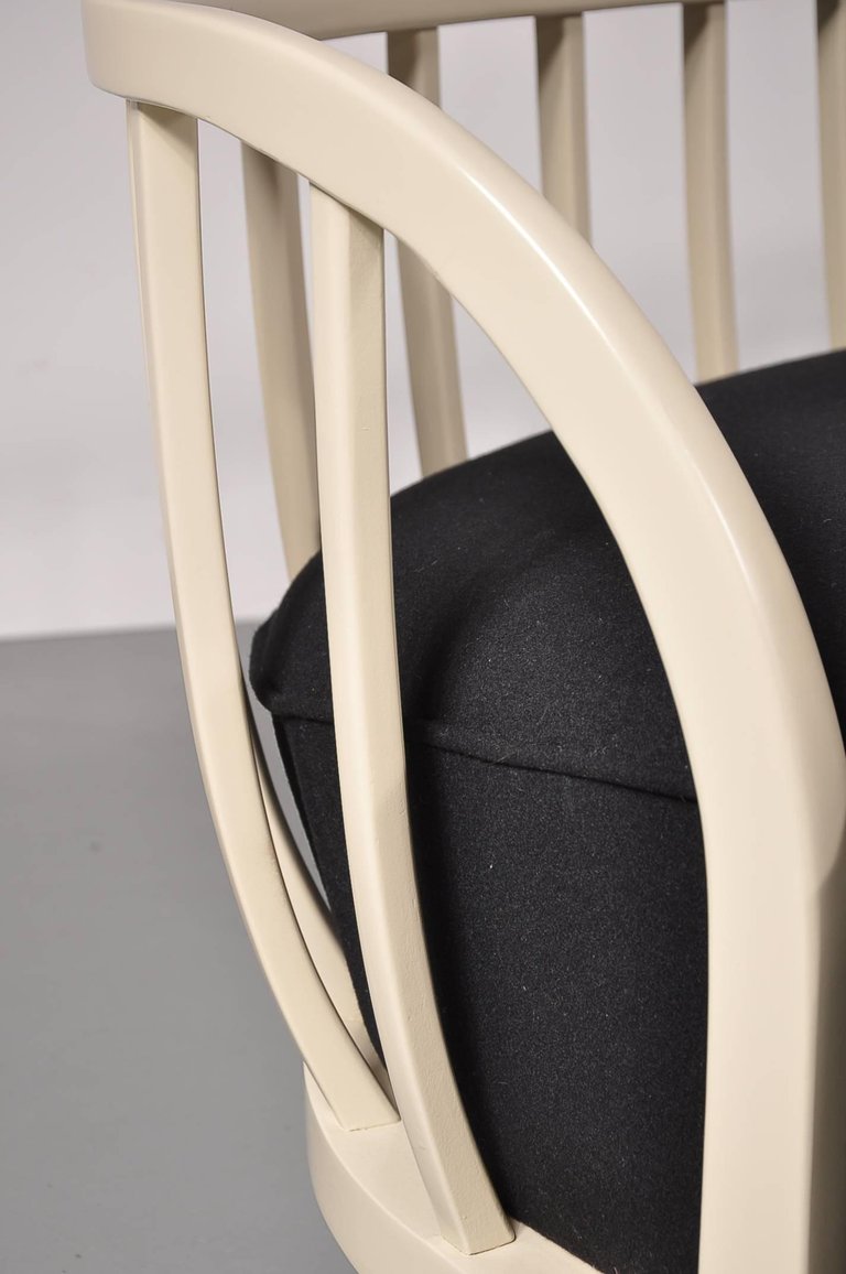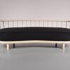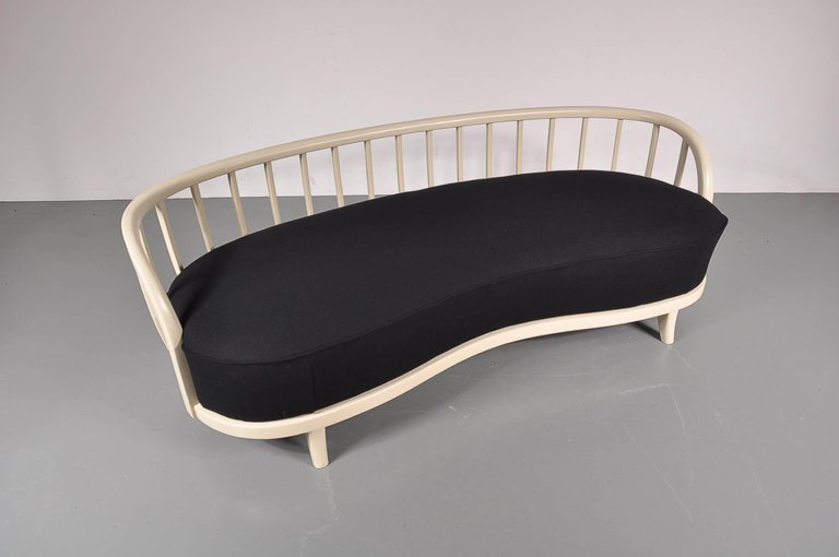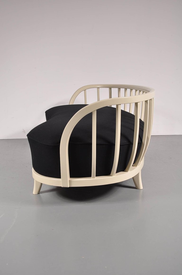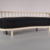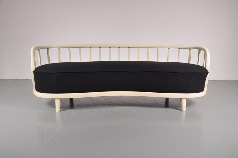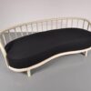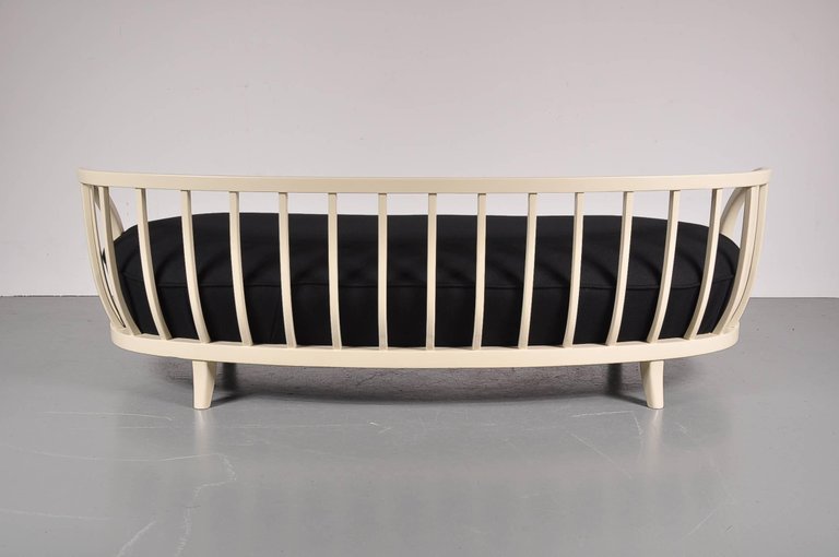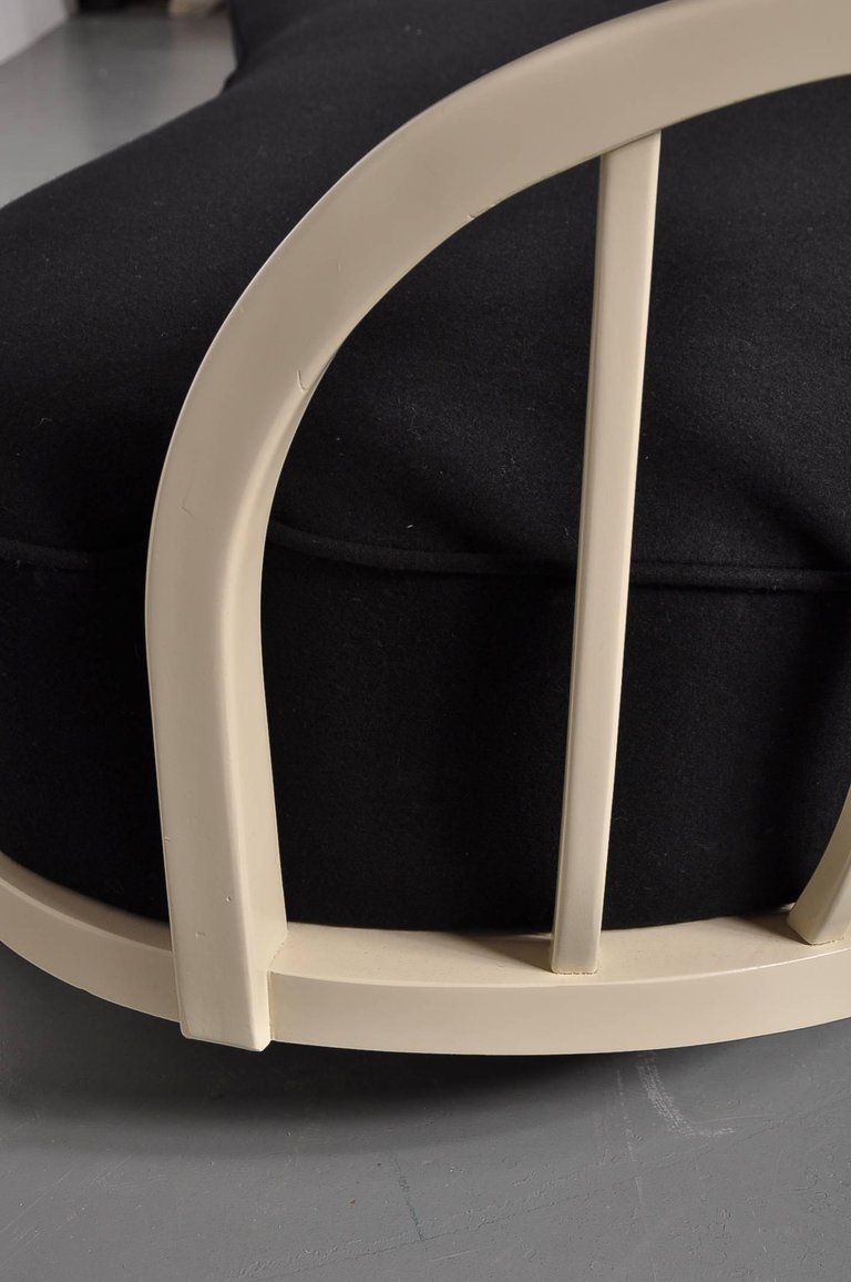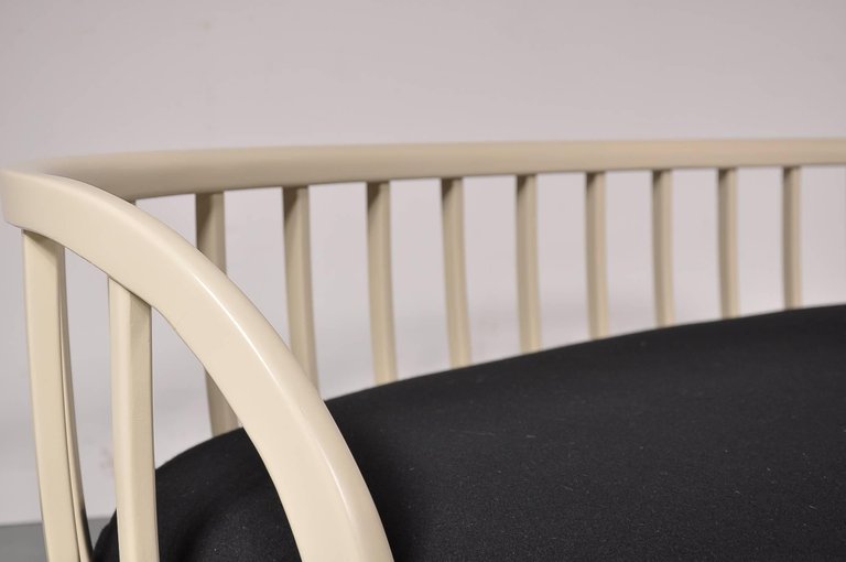 The elegant shape of the backrest is what makes this sofa stand out. Made of high quality lacquered wood and with spokes in the backrest, the overall design has a true sense of luxury. The comfortable cushion is newly upholstered in high quality black fabric, creating a wonderful contrast with the white structure. All together this sofa would make a wonderful eye-catcher in any interior. It is crafted with a great sense of design, smooth shapes and a fine eye for quality.