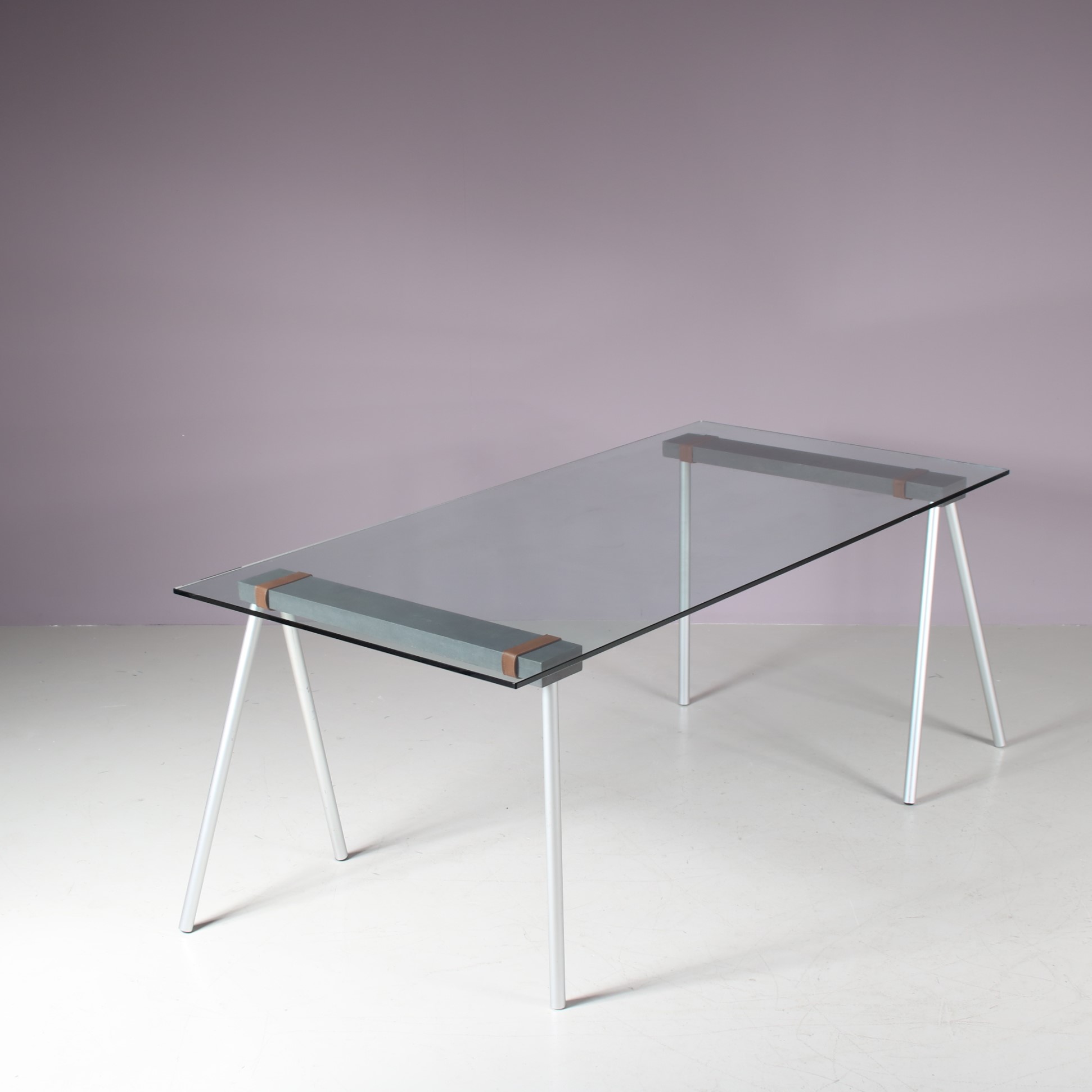This modern table is an unique and elegant piece of Belgian design. The trestles can be folded for easy transportation and allow a very versatile use for this table! This folding mechanism has been the key to this design that combines elegance, modernism and practicality. Made of matted aluminium with black coated metal supports and brown leather straps. For this individual piece, a glass top was chosen which allows the iconic structure to remain visible from every angle.